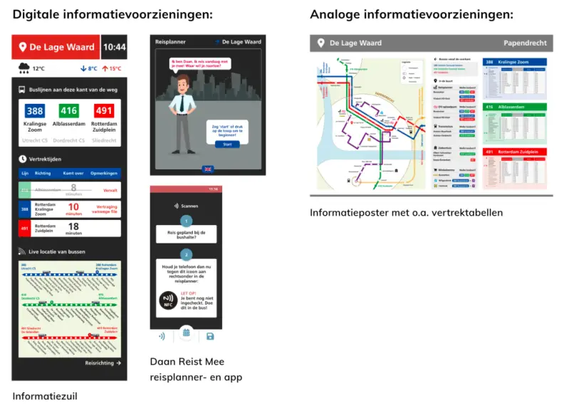 Analoge reisinformatie: We begrijpen echter dat digitale informatie niet altijd beschikbaar is door eventuele storingen, daarom hebben we ook vernieuwde analoge informatie toegevoegd. Deze informatie moet altijd aanwezig zijn en is op een duidelijke en eenvoudige manier opgemaakt. Hierdoor weten mensen snel waar en hoe laat ze de bus kunnen nemen, evenals de locaties van nabijgelegen voorzieningen zoals winkels en ziekenhuizen.